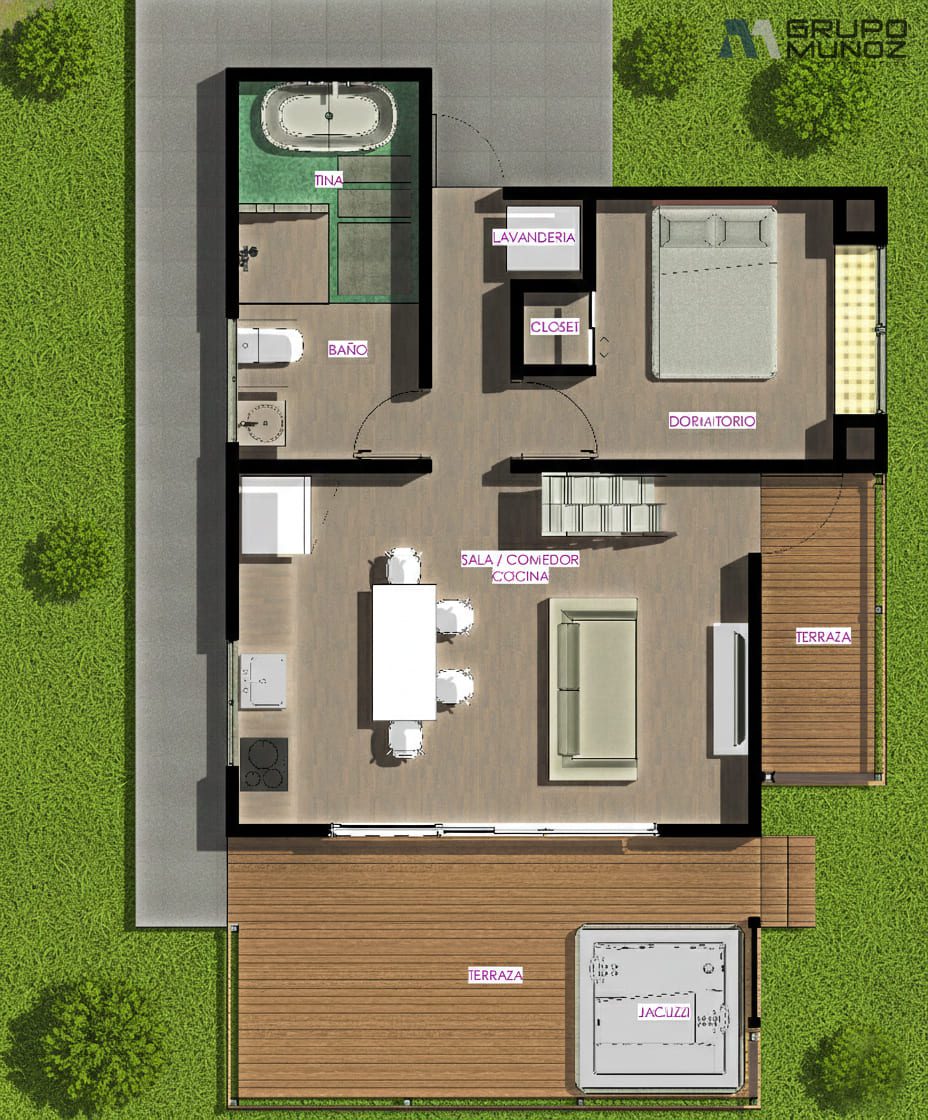CASA ENEA es una vivienda contemporánea y funcional de 49m2 área interna, mezanine 14m2 y una terraza de 17m2. Es un espacio acogedor y versátil.