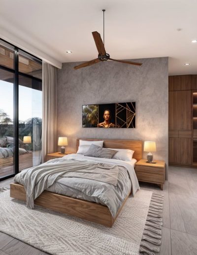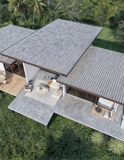 Una terraza frontal continua conecta las dos habitaciones con la entrada principal, creando una relación fluida entre interior y exterior. Sus grandes ventanales permiten que la luz natural sea protagonista, aportando amplitud, calma y confort a cada espacio.